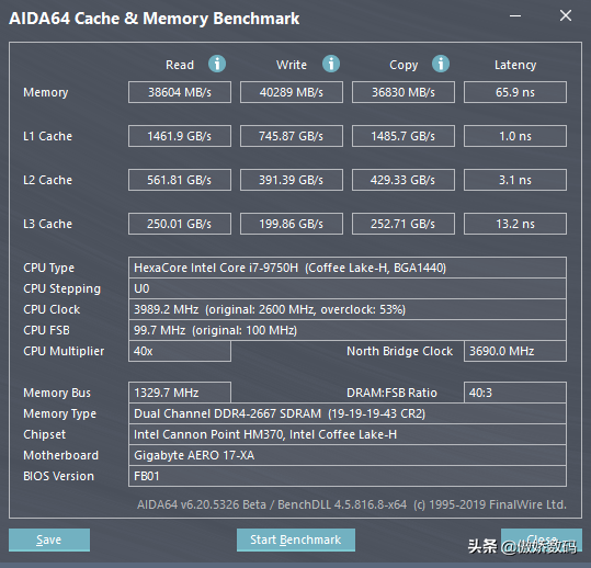 然后随便跑跑分看看,首先是AIDA64的缓存成绩,Intel平台的内存延迟还是很ok的,65.9ns的成绩换成AMD平台的话需要3800的频率才能跑出来