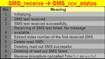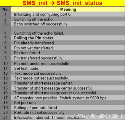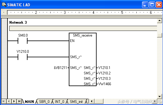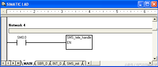 注意:上面的库功能块,除了SMS_xmt_rcv_manage不需在主程序里编写为,其它四个功能块都必须依次调用,且调用的条件是每个循环周期都执行条件是。即使是不收发SMS,也需要调用SMS_s;SMS_receive;SMS_tele_handle,原因是PLC与MD720-3信息交换是需要SMS_s;SMS_receive;SMS_tele_handle功能块来处理的,即使只是初始化MD720-3,不接收和发送信息也是需要全调用的,否则无法初始化成功。