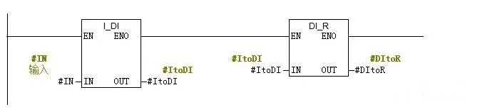 PLC在处理模拟量时,其输入和输出大多是整数,用浮点数来处理这些数据时要进行整数和浮点数之间的相互转换。例如图6所示,现场采集的数据为16位的整型数("DItoR")。由于整型数占16位,而浮点数占32位,二者不能直接转换。要先将整型数转换为双整型("#ItoDI"),然后再转换为浮点型。