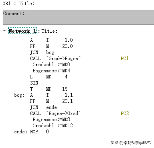 函数FC1和FC2在OB1中调用,如果开始位出现上升沿FC1被调用,如果开始位出现上升沿FC2被调用。