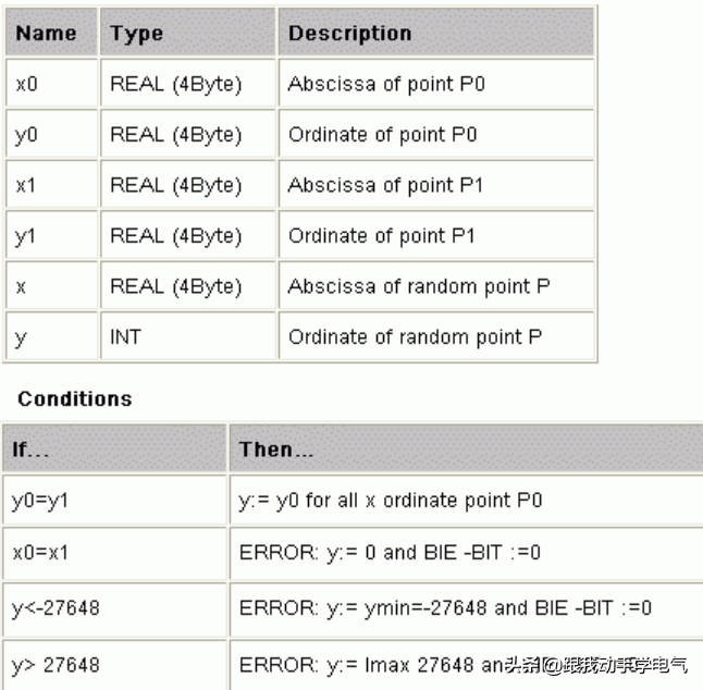 通过坐标的两个点(x0,y0)和(x1,y1)可以决定线性特征,在横坐标定义X参数的值,函数计算Y的坐标值。输出参数Y为整数类型,取值范围为-27648to~+27648.