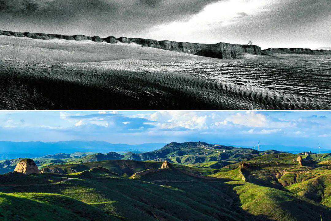 这是一张拼版照片。上图为:治理前,山西省右玉县随处可见的荒凉沙地(资料照片);下图为:2021年7月13日拍摄的山西省右玉县右卫镇的景色(新华社发徐吉摄)。