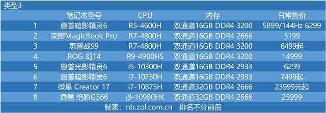 在这类笔记本中,我们测试过的R5-4600H、i9-10885H样本过少可能与实际情况存在一些出入。