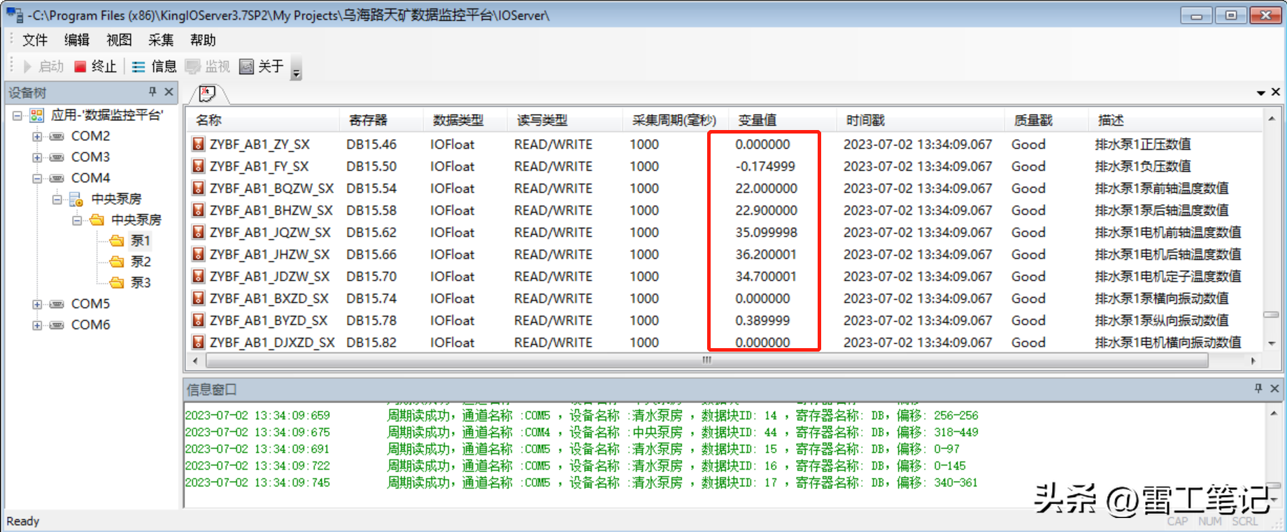 现场用KingIOServer采集西门子S71500数据,调试时发现数据值不对,经排查是变量采集属性中采集数据类型LONG,实际应为FLOAT,设置成FLOAT后数据正常。由于数据量比较大一个个修改比较费时费力,需要批量修改,下面记录批量修改操作过程。