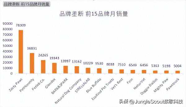 从上图可以看出,看到月销量前15名的品牌各有多少销量,判断头部品牌对于这个品牌的垄断性。一般来说,前15名品牌销量占比越低,垄断性就越弱,对新品牌也就越友好,从我们这个例子来看,显然,第一名的品牌有很强的品牌优势,市场占比非常高。