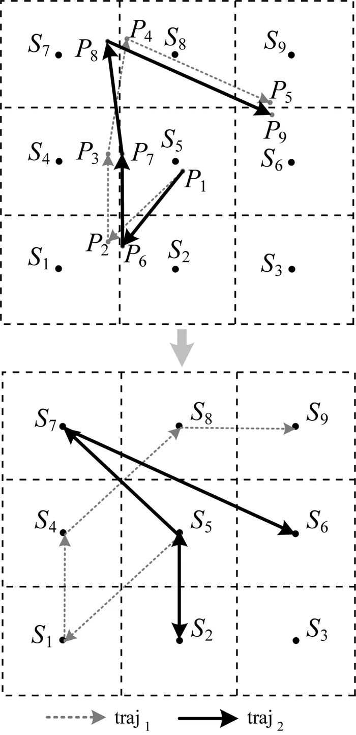 定义3:格网轨迹移动对象所在地理空间被固定格网(如正方形、三角形、六边形等)剖分成不同的空间区域,轨迹的单个坐标点pi被映射到所在的空间区域si,原始轨迹traj可被转化后格网区域序列定义为格网轨迹G_traj,表示为