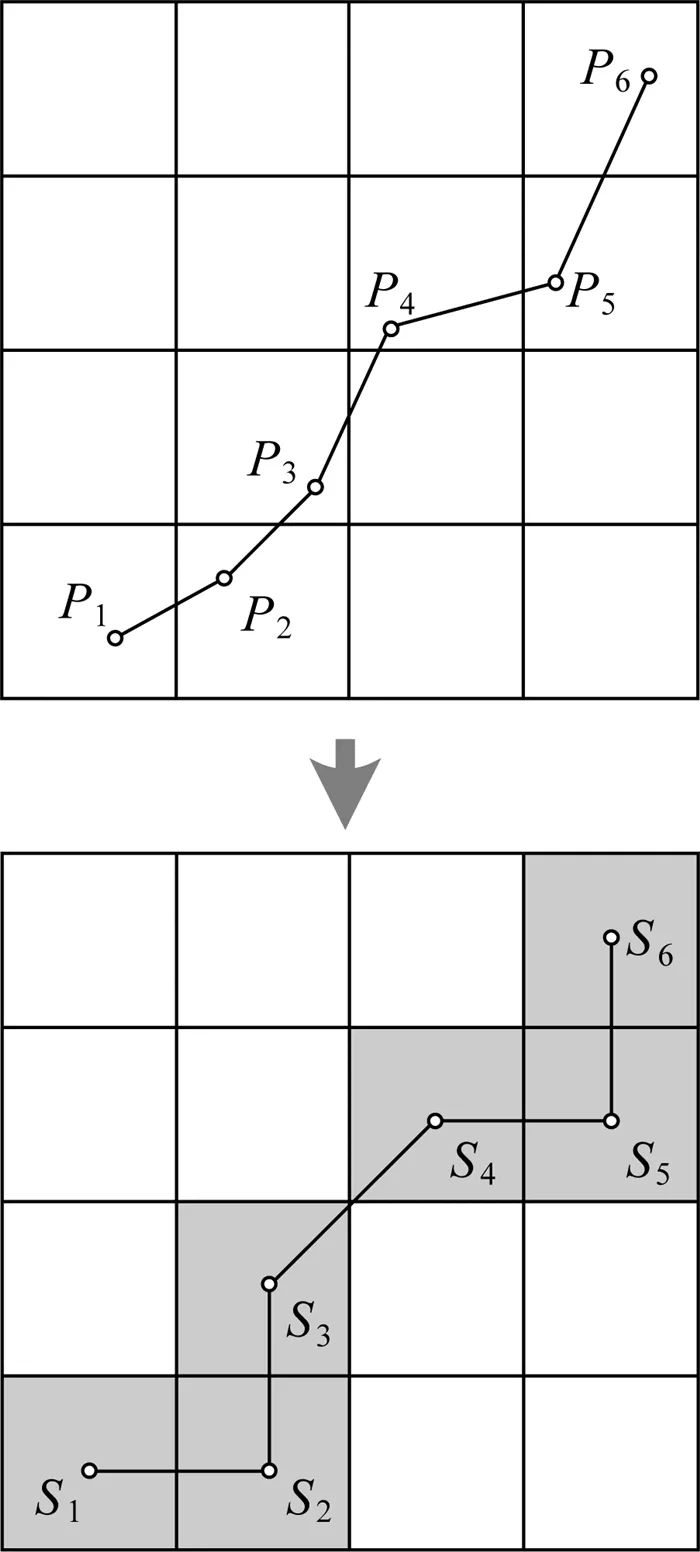 式中,ti表示时间;∀i∈[1,n),titi+1;si表示轨迹点pi映射到格网空间上后对应的格网编号。如图3所示,轨迹traj={(p1,t1,)(p2,t2),…,(p6,t6)}对应的格网轨迹为G_traj={(s1,t1),(s2,t2),…,(s6,t6)}。