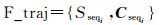 式中,Sseqi为模糊序列集合,由轨迹内各点所隶属空间单元集合计算笛卡尔积生成;Cseqi为序列隶属度集合,由轨迹内各点所对应隶属空间单元的隶属度的乘积计算生成。以图4中轨迹traj1={p1,p2}为例,其模糊轨迹为F_traj1=〈{s5s5,s5s2,s5s4,s5s1},{0.2,0.25,0.25,0.3}〉。