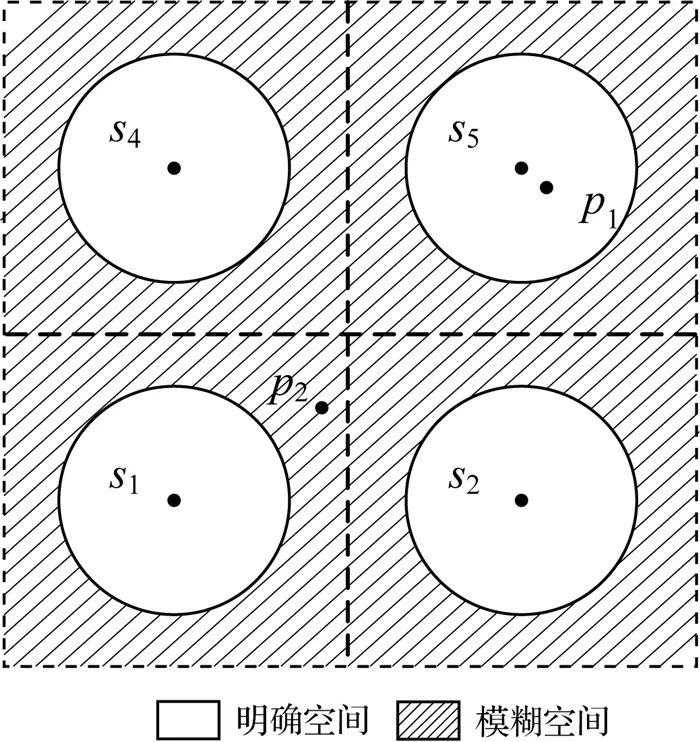 借鉴模糊集合理论思想,将格网划分为明确空间和模糊空间两部分。如图6所示,每个格网中圆形之内部分定义为明确空间,圆形之外的部分定义为模糊空间。当轨迹点落入明确空间时,该轨迹点完全隶属于其所在格网;而当轨迹点落入模糊空间时,定义该轨迹点隶属于距离其最近的四个格网。当给定一系列格网S={s1,s2,s3,…,sj}和轨迹点pi,可以依据式(1)和式(2)计算其模糊空间隶属度