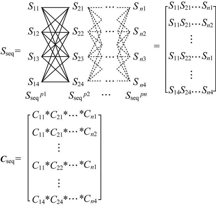 为适应模型输入,需将轨迹切分为固定轨迹点数目的子轨迹,并分别计算子轨迹模糊空间隶属度。对一段子轨迹seqm,其模糊子轨迹可以用模糊子轨迹序列集合Sseqi和对应子轨迹序列隶属度集合Cseqi表示。如图7所示,模糊子轨迹序列集合Sseqi为子轨迹内各点所隶属空间单元集合计算笛卡尔积获取的序列集合,子轨迹隶属度集合Cseqi由轨迹内各点所对应隶属空间单元的隶属度的乘积计算生成。
