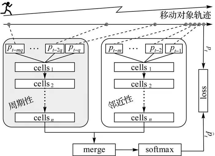 为同时考虑轨迹邻近性和周期性对移动对象下一时刻位置的影响,构建两种子轨迹作为模型输入:邻近性子轨迹和周期性子轨迹。其中,邻近性子轨迹由移动对象刚刚经过的位置组成,用于刻画轨迹邻近性影响;周期性子轨迹由移动对象前几天同一时刻所在位置组成,用于刻画轨迹周期性影响。依据2.1.2节模糊子轨迹生成算法,分别将邻近性子轨迹和周期性子轨迹转换为对应模糊子轨迹,并作为输入数据传输到轨迹预测模型中。