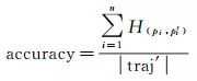 已知轨迹序列trajk=〈p1,p2,…,pn〉和预测轨迹序列traj′k=〈p′1,p′2,…,p′n〉,预测准确率计算如式(9)、式(10)所示