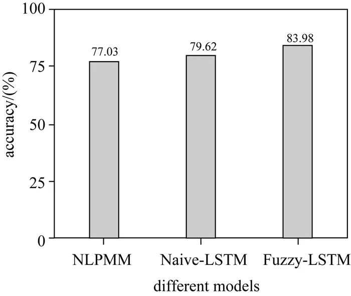 试验结果表明,本文提出的Fuzzy-LSTM算法预测准确率为83.98%,较Naïve-LSTM算法和NLPMM算法分别高出4.36%和6.95%。其中,Fuzzy-LSTM算法和Naïve-LSTM算法预测准确率均高于NLPMM算法,是因为在预测过程中考虑了长期依赖信息,提高了算法的预测性能。同时改进后的Fuzzy-LSTM算法预测准确率优于Naïve-LSTM算法和NLPMM算法,说明考虑模糊空间隶属度和移动对象轨迹周期性影响有利于提高轨迹预测算法性能。