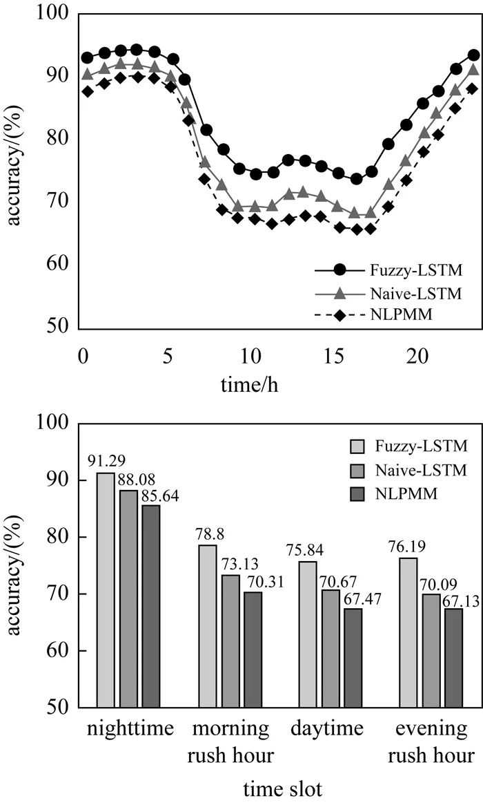 城市居民在不同时间段具有不同的轨迹特征。本文比较了Fuzzy-LSTM预测模型在不同时段的轨迹预测准确率。结果如图10所示。