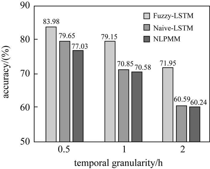 其次,数据时间粒度决定移动对象轨迹被概化的程度,数据时间粒度越大数据采样越稀疏。受限于手机信令数据精度,本文在30min时间粒度基础上,分别将数据概化为1h、2h两种粒度,测试模型预测准确率变化。结果如图11所示。依据统计结果,Fuzzy-LSTM模型的轨迹预测精度随时间粒度增大而略有下降,时间粒度为1h、2h时,较之30min粒度的轨迹预测准确率分别下降4.83%、12.03%。模型预测准确率降低的原因在于随时间粒度增大,数据源概化程度更高,且模型训练数据量减少,使得模型对移动对象运动特征的学习效果不佳。但本文所提出的Fuzzy-LSTM模型在不同时间粒度下的预测精度均保持最高。