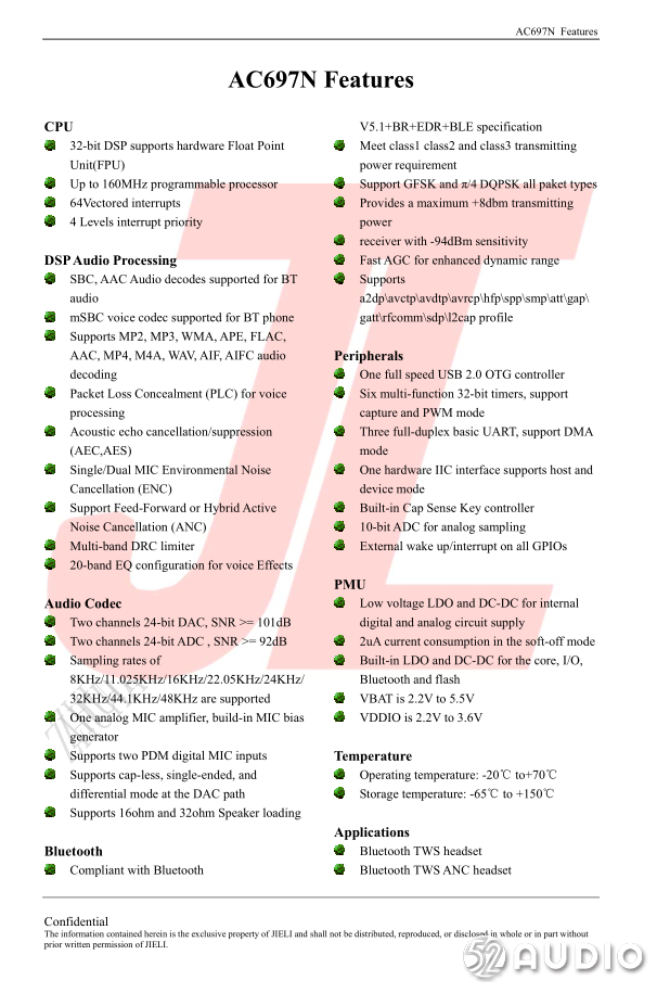 杰理AC697N是一颗超低功耗全集成自适应主动降噪方案蓝牙芯片,最低功耗可达5mA以下,32位DSP支持硬件浮点运算,支持蓝牙5.1+BR+EDR+BLE,24-bit的DAC,信噪比最高可达103dB,24-bit的ADC,信噪比最高达92dB以上,最多可支持三路麦克风。