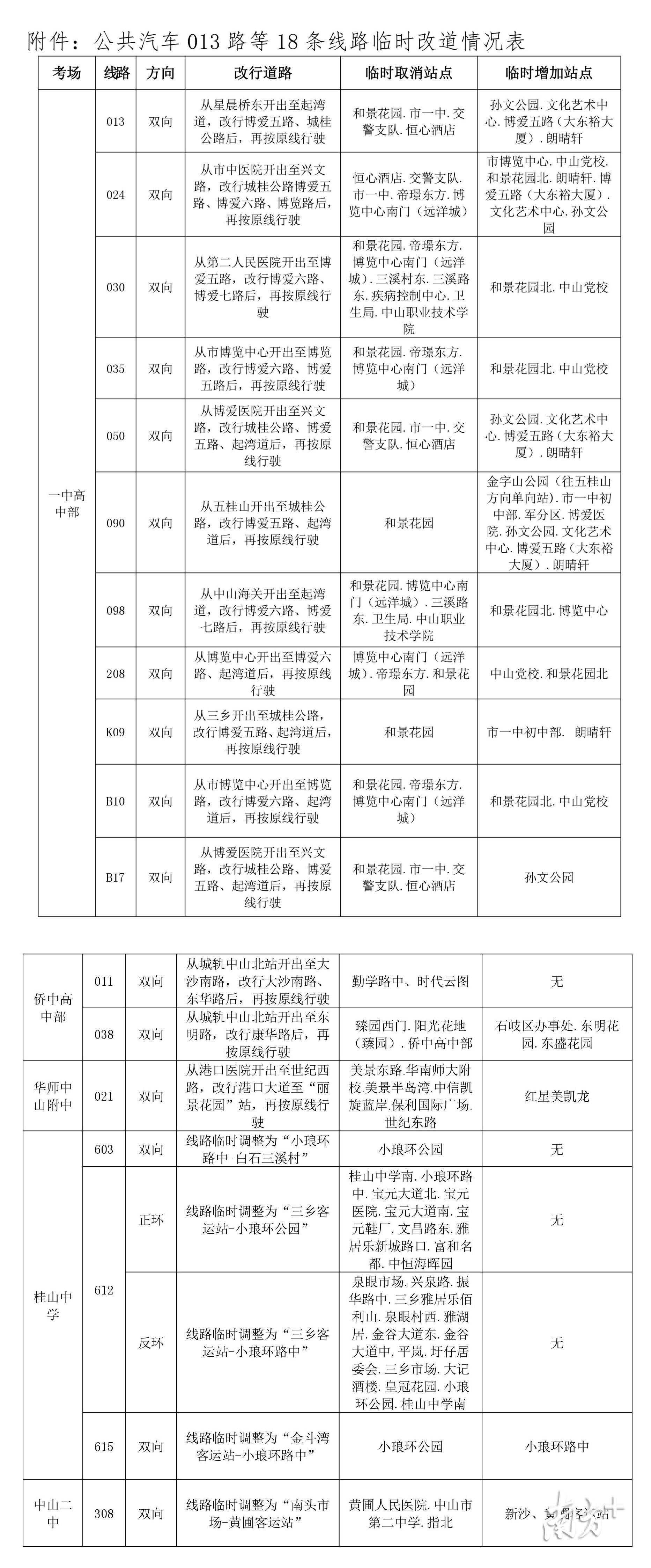 记者从中山市公交集团获悉,受影响的线路包括市一中高中部、市华侨中高中部、华师中山附中、桂山中学、中山二中路段,由于交通管制将对部分公共汽车线路造成影响,这部门路段临时改道行驶,范围包括一中高中部的013、024、030、035、050、090、098、208、K09、B10、B17,侨中的011、038,华师附中的021,桂山中学的603、612、615,中山二中的308。