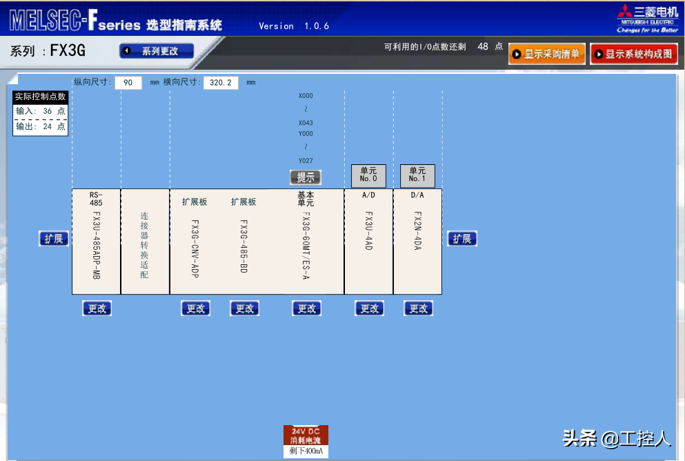 另外,我们的plc要想全部控制这些外围设备,光靠基本单元是不够的,还需要额外的扩展模块,如下图的选型组合,基本单元是FX3g-40mt,控制模拟量的输出需要DA模块如FX2N-4DA,采集传感器模拟量信号的AD模块如FX3U-4AD,通信有两个通道,通道1通过FX3G-CNV-ADP连接一个FX3U-485ADP通信适配器,通道2连接的是FX3G-485BD的通信板。如果输入输出端子不够还可以再右侧继续安装扩展模块。
