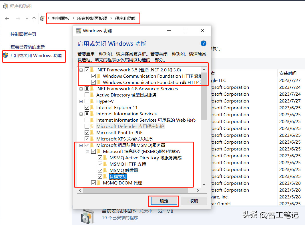 4、打开控制面板-程序和功能-启用或关闭Windows功能,安装.运行环境和MSMQ服务器。