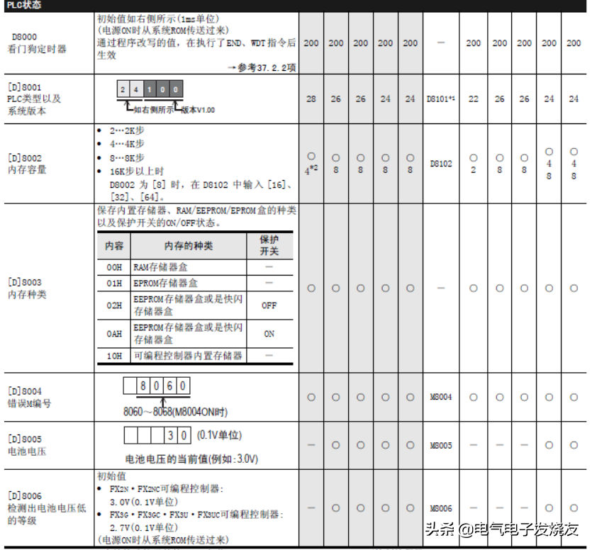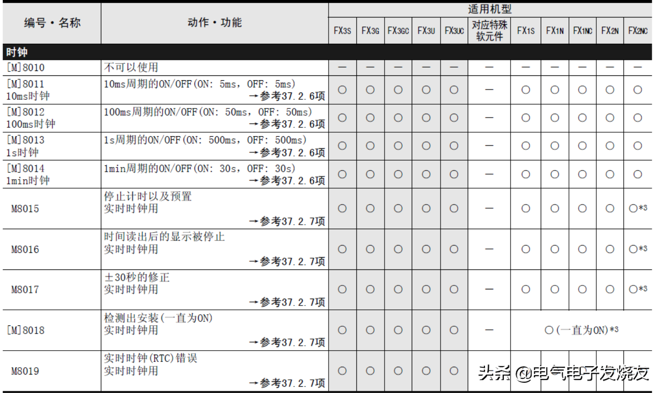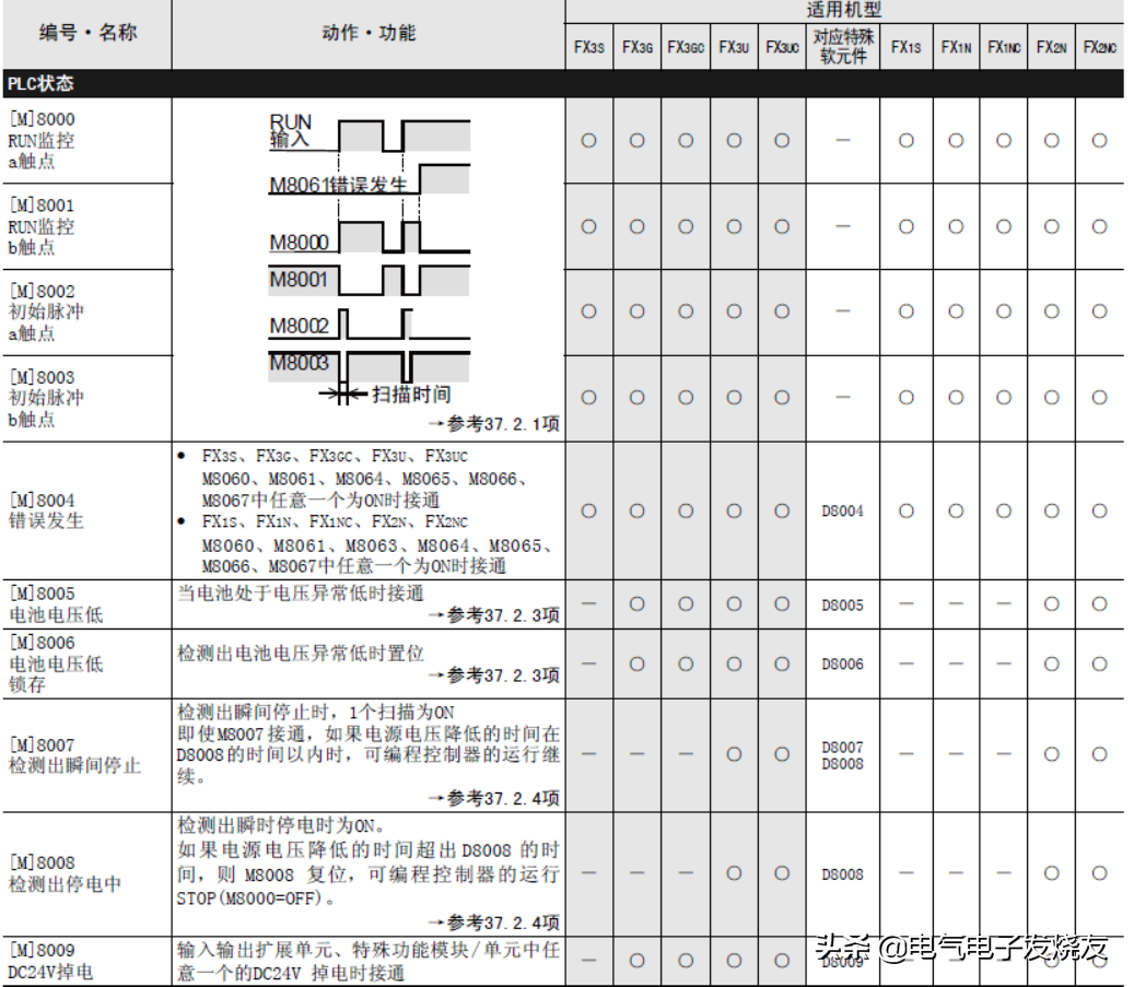 首先特殊辅助继电器(表中简称为特M)和特殊数据寄存器(表中简称为特D)的种类以及其功能如下所示。此外,根据可编程控制器的系列不同,即使是同一软元件编号,有时候功能内容也可能有所不同,请务必注意。