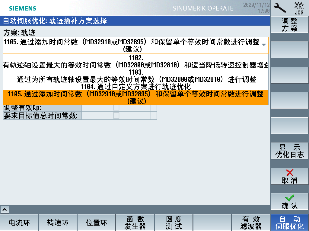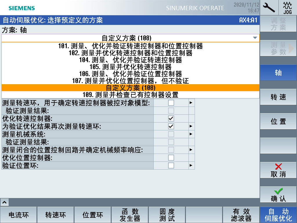 在对话屏幕“选择优化方案”中可通过软键“自定义”,可自定义轴方案、速度环方案、位置环方案。