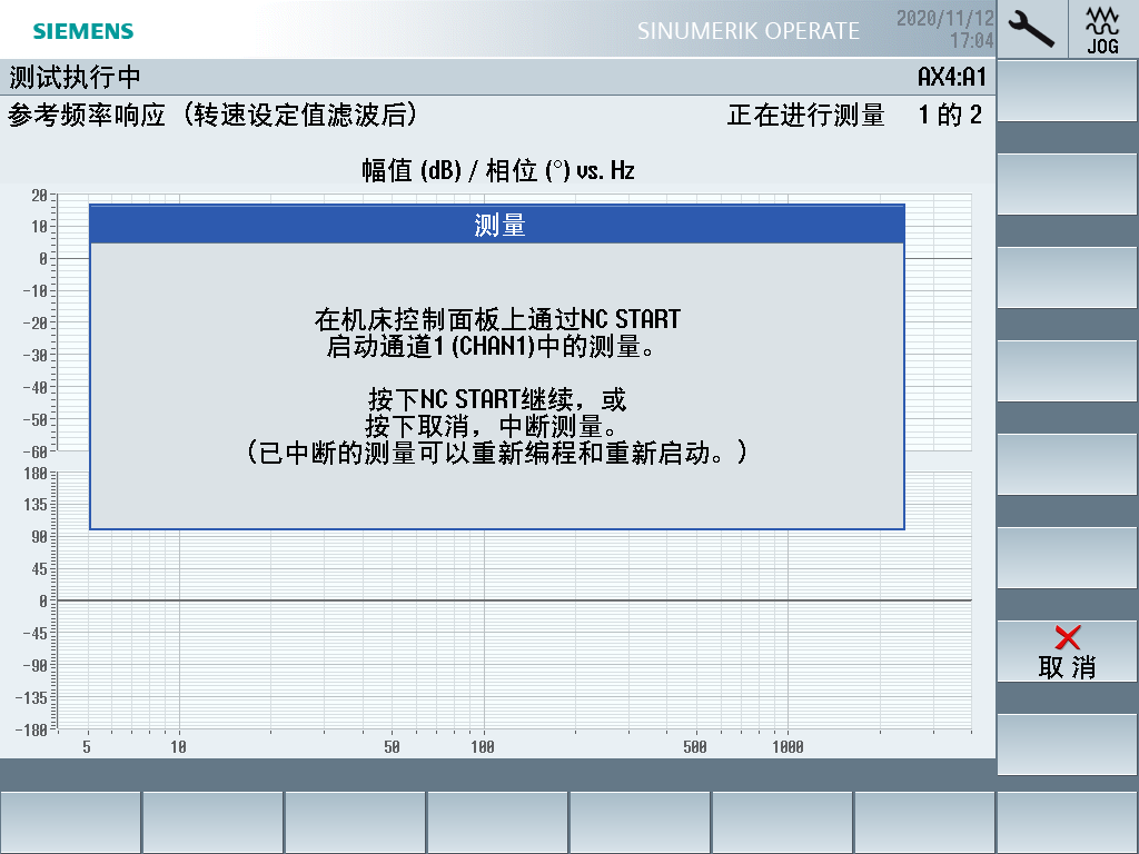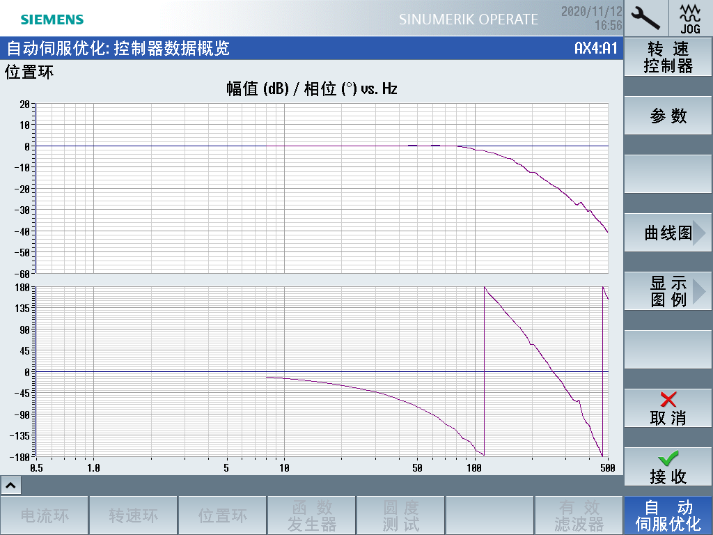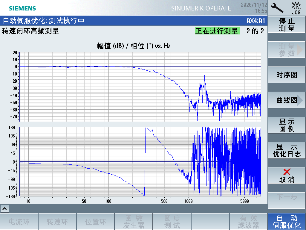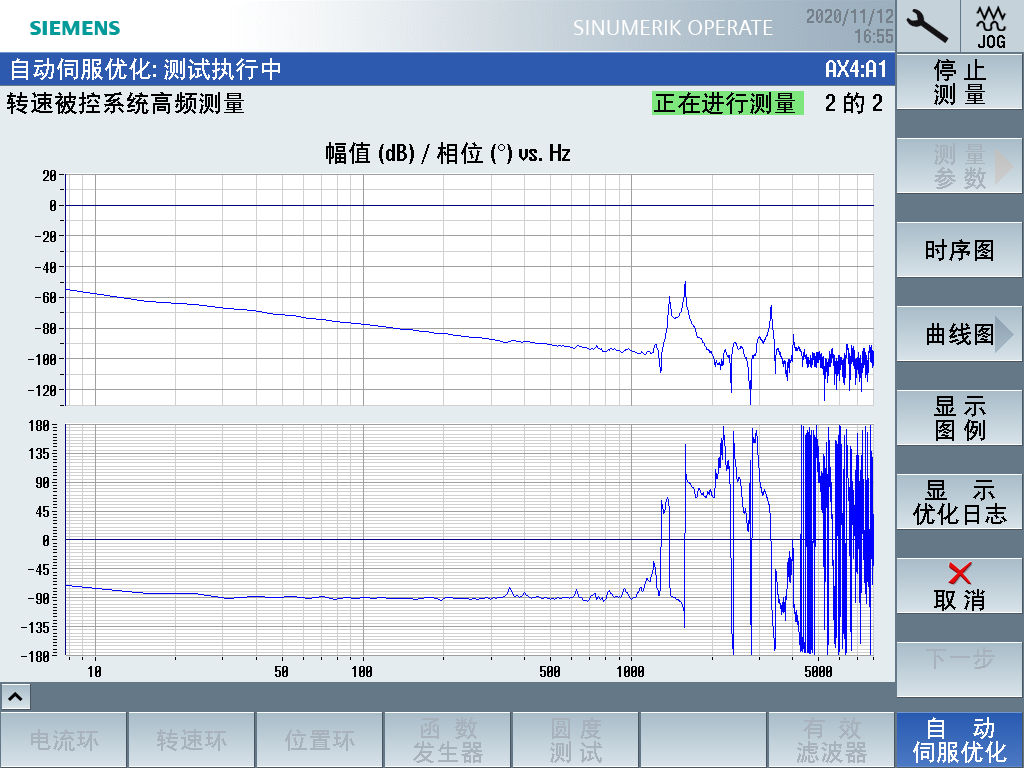 根据提示按下MCP上的“CYCLESTART”键启动测试,HMI上显示优化过程中的测试曲线,可在自动伺服优化的任意步骤中按“RESET”中断优化进程,优化中断后将会恢复启动优化前的原始数据.