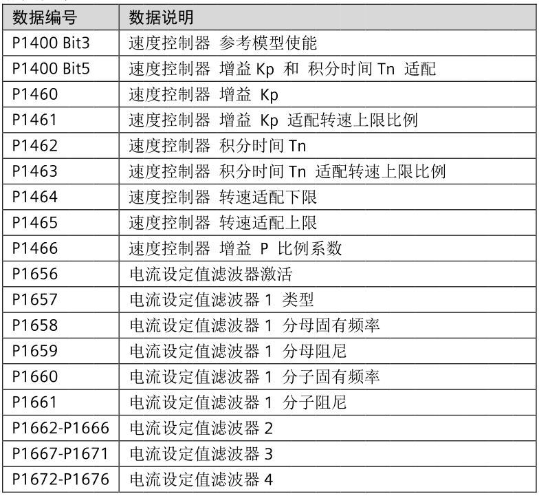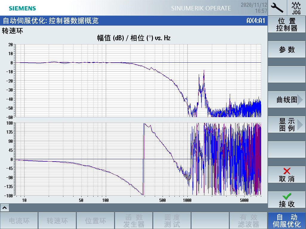 速度环参考频率响应允许超调+3db,速度环参考频率响应的共振点尖峰突起,可通过电流设定值滤波器(p1656到p1676)来进行抑制,从而可进一步提高速度环增益。200HZ以下不加滤波器。