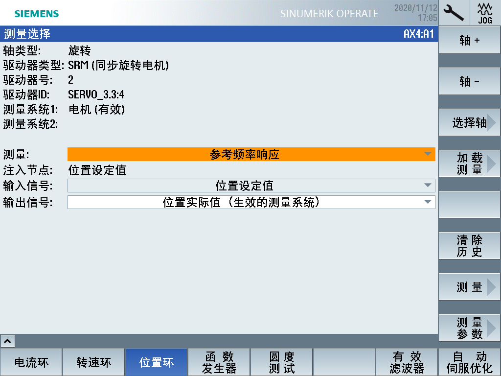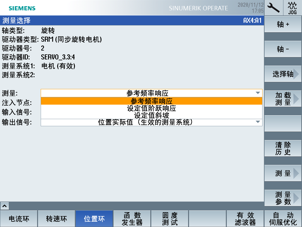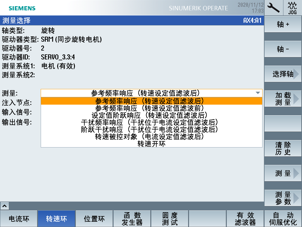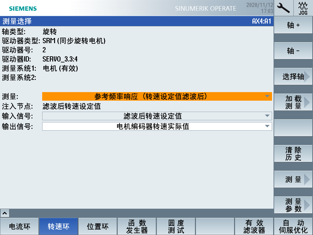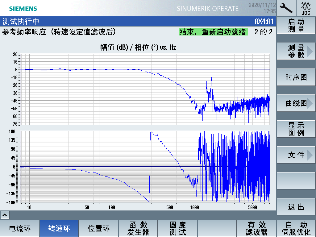 速度环优化包括参考频率响应、设定点阶跃响应、扰动阶跃响应、速度控制系统以及机械部件的频率响应等多种测试手段。其中参考频率响应是最主要的测试,由它决定速度环的增益Kp(MD1460)和积分时间常数Tn(MD1462),如果需要设置电流设定点滤波器;