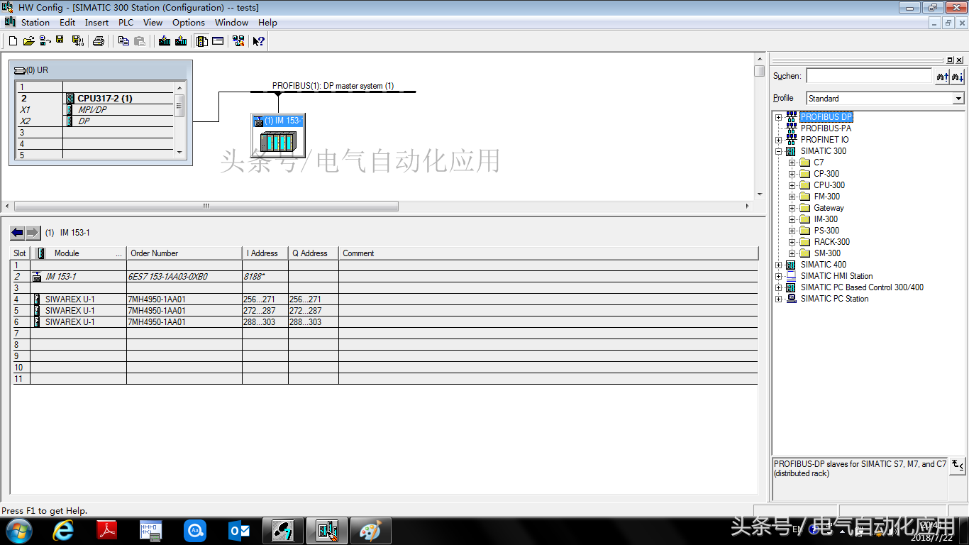 首先我们打开STEP7,新建项目配置后CPU后打开硬件组态,将需要的模块拖进去。然后硬件是这样的。目前为止硬件我们就配置完成。