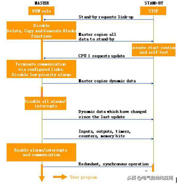 2.若备用CPU(CPU1)请求LINK-UP,主CPU和备用CPU将比较它们的用户程序。如果发现用户程序之间存在差异,主CPU会更新备用CPU的用户程序。