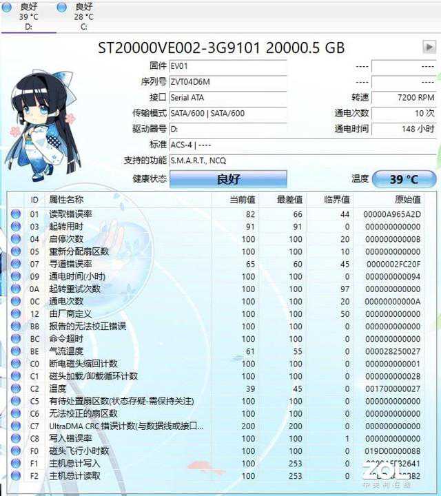 首先来看硬盘信息,其固件版本为EGV01,传输模式为SATA/600,支持标准为ACS-4,支持的功能为、NCQ,转速为7200RPM。实际的可用容量约为18.2TB。