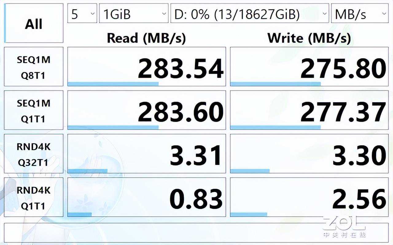 通过CrystalDiskMark实测,可以看到其顺序读取的速度为283.54MB/s,顺序写入的速度为275.8MB/s。4K随机读取速度为0.83MB/s,4K随机写入的速度为2.56MB/s。