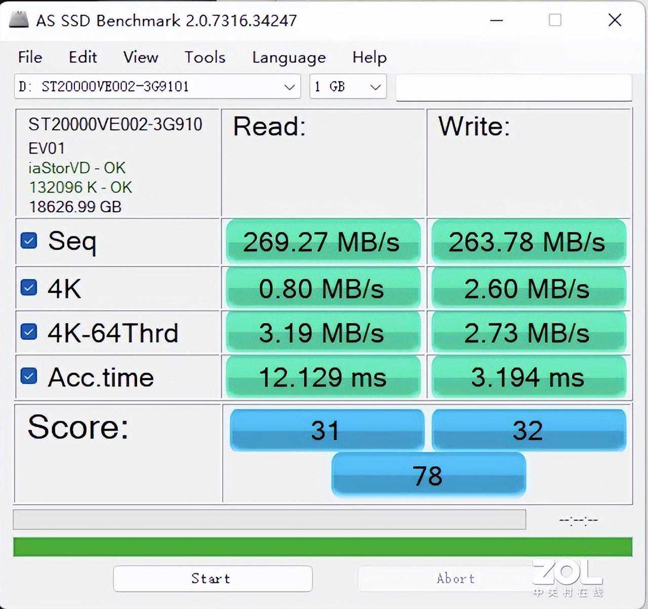 在ASSSDBenchmark测试中,希捷酷鹰AI20TB硬盘的顺序读取速度为269.27MB/s、顺序写入速度为263.78MB/s。4K随机读取速度为0.8MB/s,4K随机写入速度为2.6MB/s。