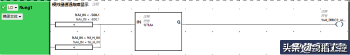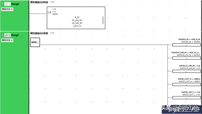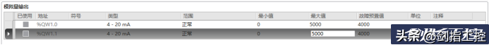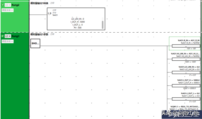 *在模拟量输出1参数程序段中,%MF60(输入实时值)设成100,%MF52(输入最大值)设成1000,计算出模拟量输出%等于500。