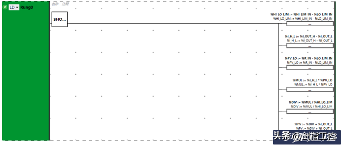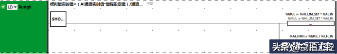 *在模拟量输出0参数程序段中,%MF50(输入实时值)设成50,%MF52(输入最大值)设成100,计算出模拟量输出%等于2500。