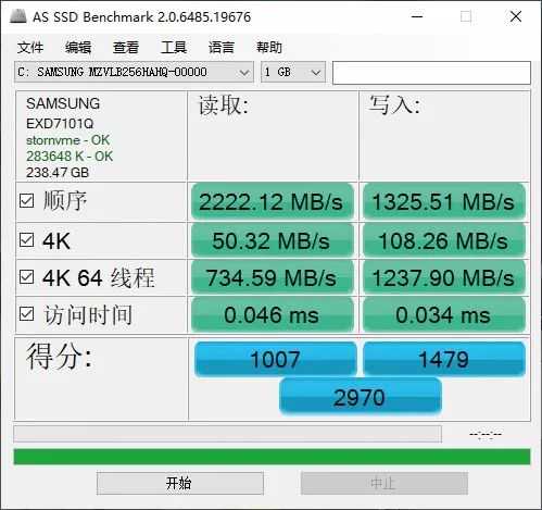 而对于三星PM981SSD,我们通过ASSSDBenchmark软件测试(1GB数据)得出这块SSD的连续读取速度为2222.12MB/s,连续写入速度为1325.51MB/s,如此优秀的表现可以说为系统的流畅性提供了保障。