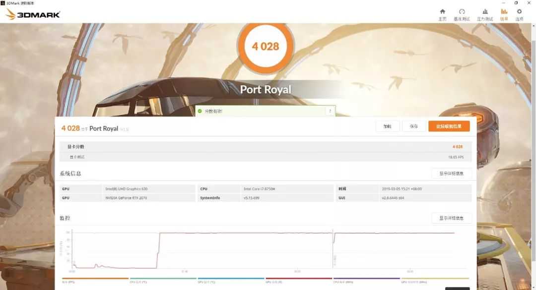 ▲3DMarkPortRoyal光线追踪测试成绩4028分,表现稳定。