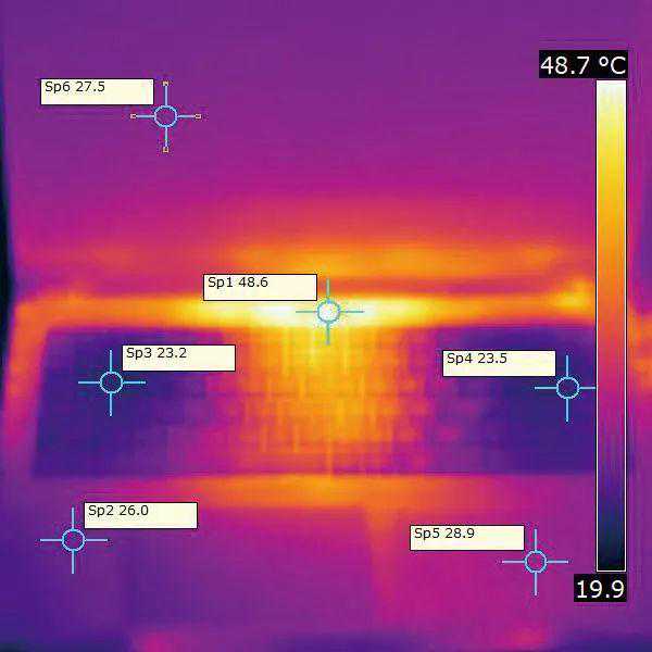 双拷一小时后,整机外表最高温为48.6℃,主要位于C面正上方。从热成像图来看,这台机器的键盘左右两侧温度较低,其中游戏玩家常用的WASD键位温度保持在23.2℃左右,键盘左侧的温度也稳定在23.5℃,同时左右两侧碗托位置的温度也在30℃以内。整体而言表现不错,仅仅在键盘中央区域摸起来有一丝温感。
