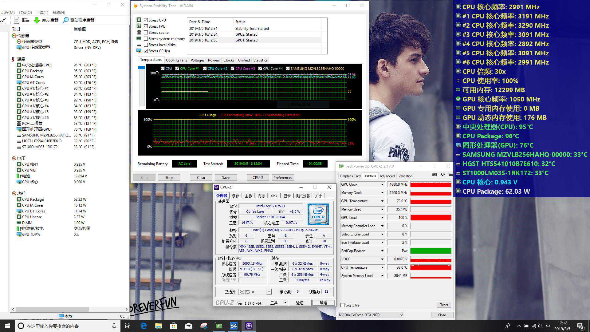 在稳定性方面,在长达一小时的双烤过程中,我们注意到CPU六核心保持全开,主频长时间稳定在3.0GHz~3.1GHz之间,CPU封装温度保持在96℃左右,GPU的温度则是76℃,整体表现还算稳定,尽管CPU温度偏高,但这是双烤极限状态,日常使用时很少会达到这种极限状态。