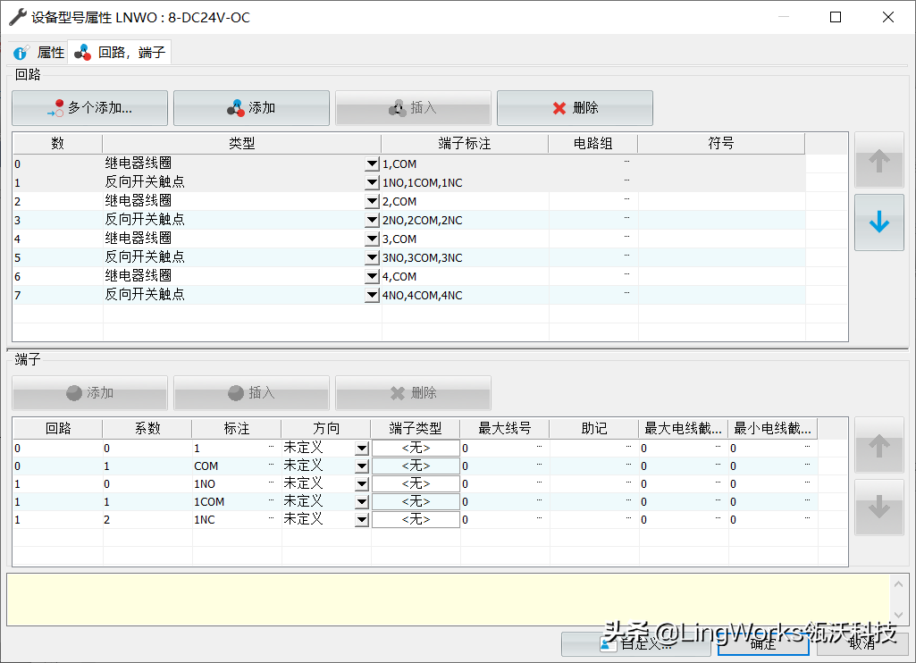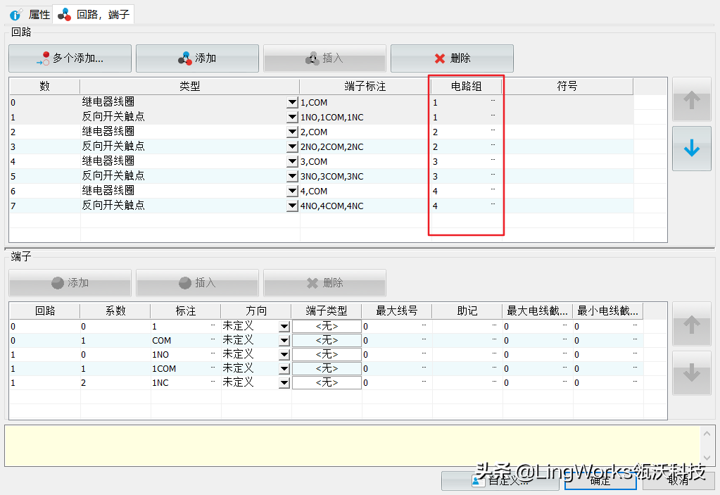 想要正确区分每路继电器的线圈和触点,需要用到设备型号的“电路组”属性(2020版之前该属性为“群”)。我们需要将同一组线圈和触点的“电路组”属性设置为相同值,如下图所示。