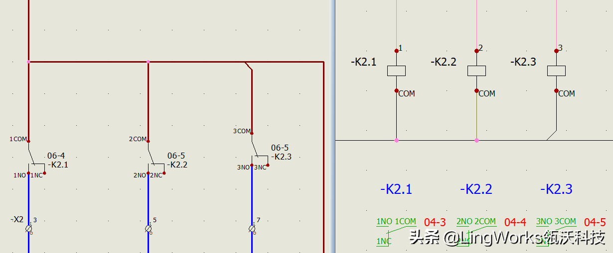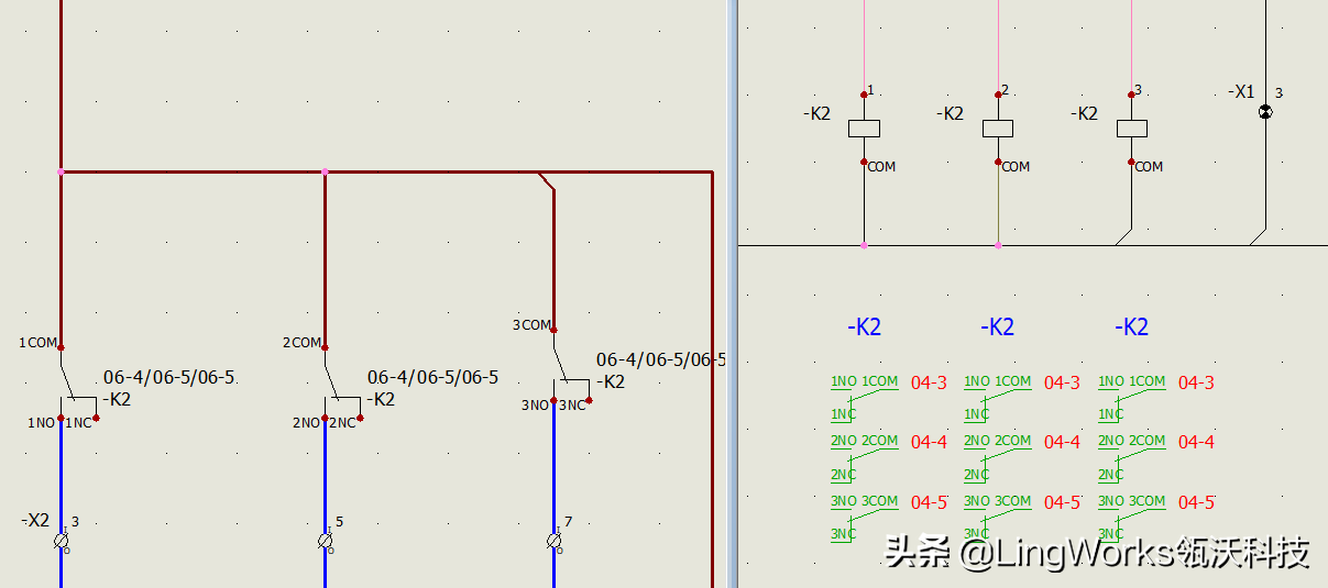 电气原理图分为归总式和展开式两种,展开图有诸多优点如原理清晰,版面简洁等。在展开图(展开式原理图)中线圈与触点按需要分开绘制,为了体现设备的完整性,通常在线圈下方绘制该设备的触点镜像。如下图所示。触点镜像绘制在SolidWorksElectrical中称之为“交叉引用”。