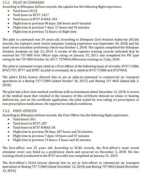 两名飞行员的资历在前文已经说明过,此处不再赘述。需要补充说明的是,根据调查报告展示的两名飞行员详细飞行小时记录,机长亚里德格塔8122飞行小时中737NG系列1417小时,737MAX8为103小时。而副驾驶努尔361飞行小时,其中737NG系列207小时,737MAX8为56小时。