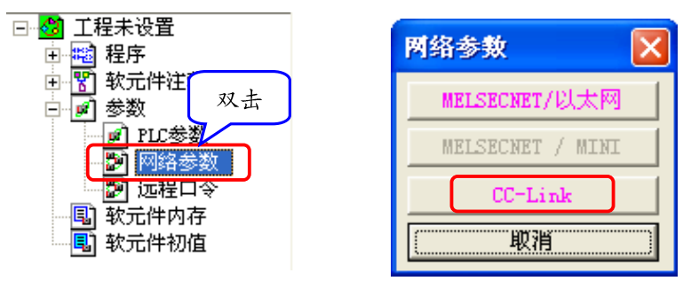 (2)双击项目管理器中的“参数→网络参数”,在弹出的“网络参数”对话框中选择“CC-Link”。