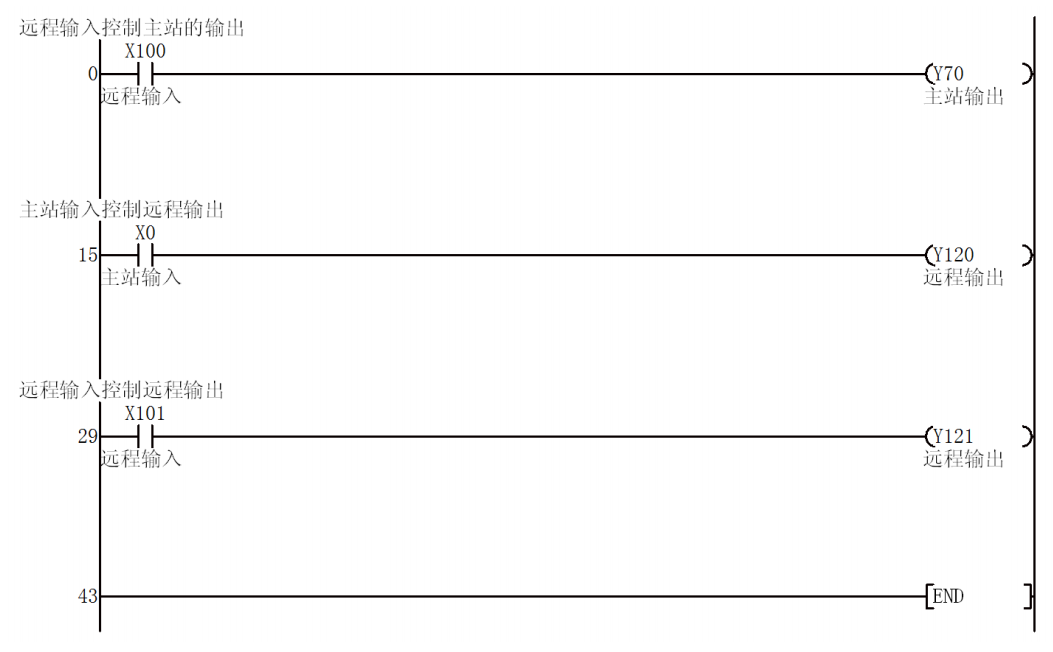 1号站远程输入模块的RX00控制主站的Y70有输出;主站的X0控制远程输出模块的RY00有输出;1号站远程输入模块的RX01控制远程输出模块的RY01有输出。