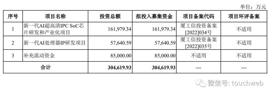其中,16.2亿元用于新一代AI超高清IPCSoC芯片研发和产业化项目,5.76亿元用于新一代AI处理器IP研发项目,8.5亿元用于补充流动资金。