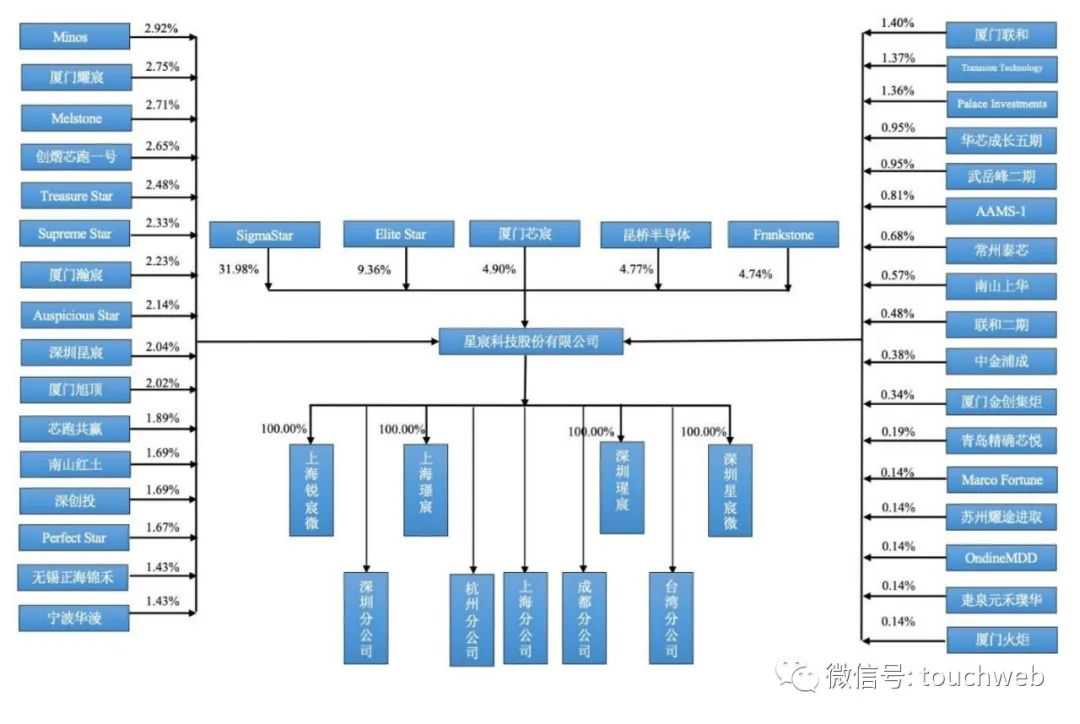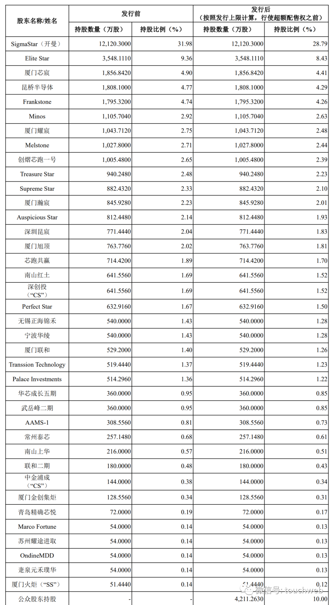 IPO后,SigmaStar(开曼)持股为28.79%,EliteStar持股为8.43%,厦门芯宸持股为4.41%,昆桥半导体持股为4.29%,Frankstone持股为4.26%,Minos持股为2.63%,厦门耀宸持股为2.48%,Melstone持股为2.44%,创熠芯跑一号持股为2.39%,TreasureStar持股为2.23%;