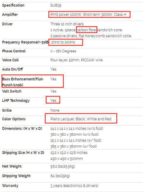SUB35V是SUB35的高性价比版本。取消了曲线调节旋钮,同时将单元变为相对亲民的玻纤盆,同时没有人见人爱的多色钢琴漆,但主要性能指标没有任何缩水!追求高性价比的最佳选择。