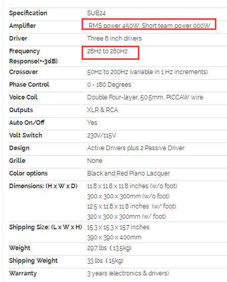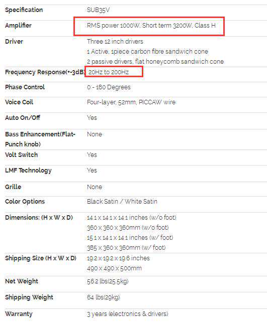 采用一个12寸的碳纤维主动单元和两个12寸的被动单元,内置高达3200W(RMS1000W)的功放。