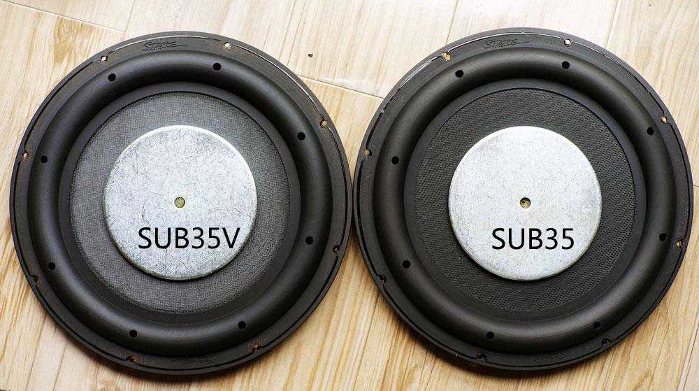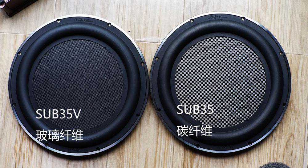 大家注意上图,SUB35和SUB24的碳纤维盆,和SUB35V的玻璃纤维盆,从外观上看,在振膜的光泽度上有明显区别。