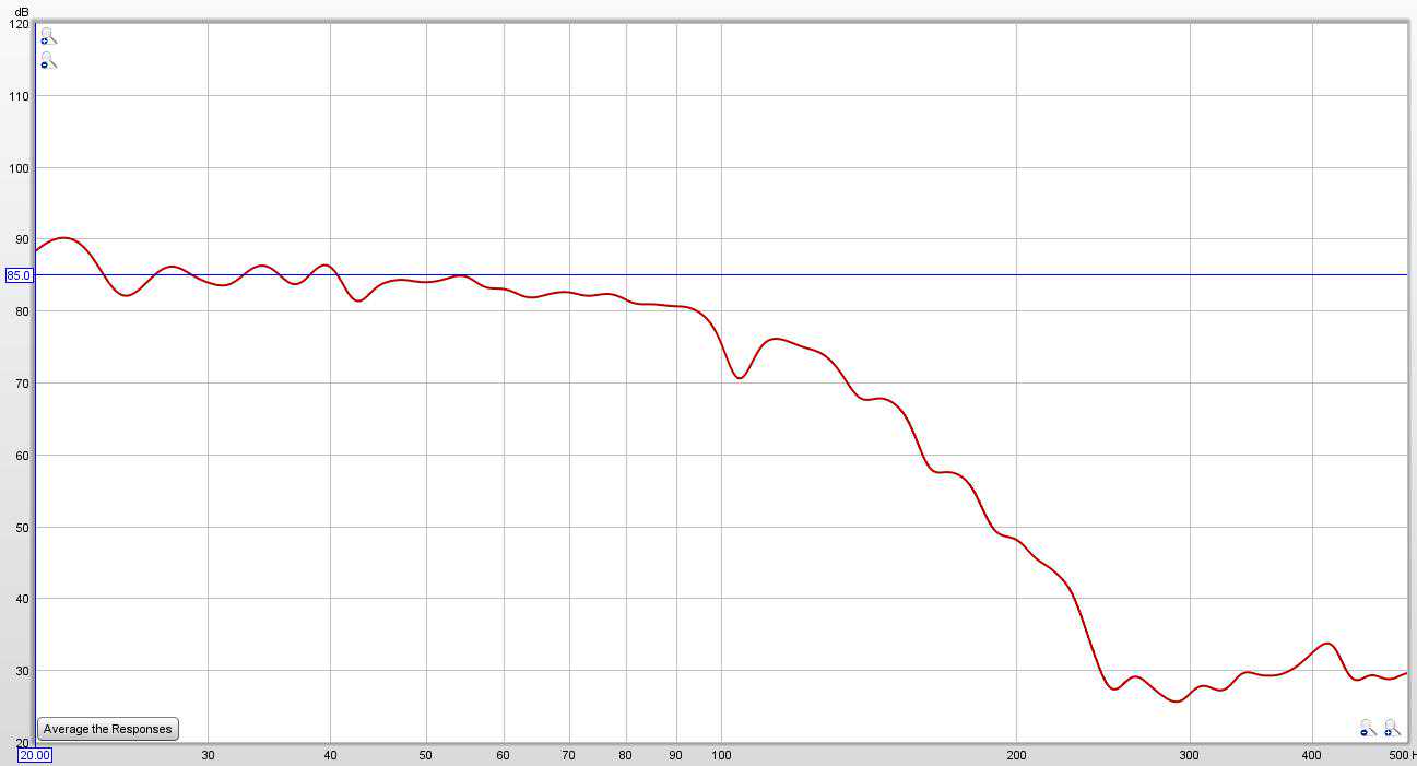 很明显,这个号称频率响应(+-3db)是20Hz~200Hz的确在30HZ以下也有非常不错的低频能量,所以在室内房间的增益之下,30HZ以内频响没有衰减。